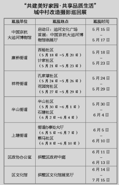 本次摄影展活动将于5月15日(下周一)在运河广场启动。随后摄影展将搬到拆迁一线,到拱墅区康桥、祥符、半山、上塘北部4个街道开展为期2个月的巡回展。