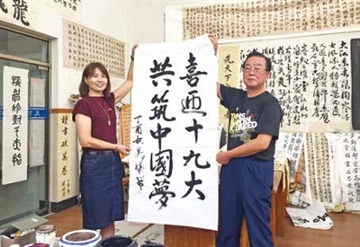 只见来自吴家墩社区的老党员吴炳奎手执墨笔,挥斥方遒,不一会儿,一幅写有“喜迎十九大 共筑中国梦”的书法作品映入眼帘,让人眼前一亮。吴炳奎用这种方式表达了自己对十九大即将召开的喜悦之情。