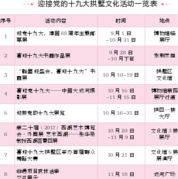 活动期间,拱墅的各大博物馆和图文新馆、文化馆也将持续开展以“喜迎十九大”为主题的邮票、书画、摄影等各类有意思的展出,还有机会一睹名家名作。