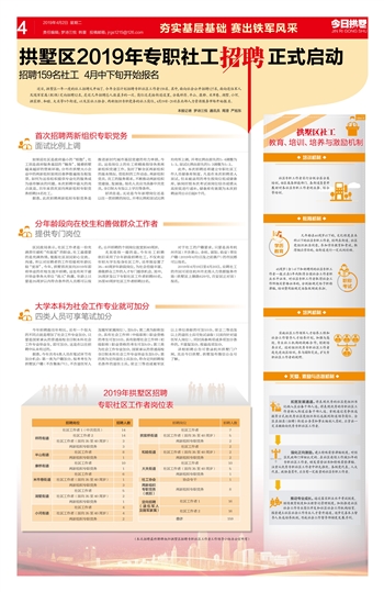 区民政局表示,社区工作者是一份充满责任感和“有温度”的职业,社工最重要的是充满热情,能跟社区居民贴心交流、沟通,所以对应聘者的工作经验和年龄比较“宽容”。今年,拱墅首次面向2019年即将毕业的在校生放开招聘,这也有利于避开毕业季各大单位“抢人”热潮。年龄上只要是35周岁以内符合条件的人员都可以报名,公开招聘的个别岗位放宽到40周岁。