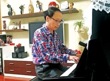 推开门,映入眼帘的是一个质朴而温馨的艺术之家。客厅里,摆放着一架钢琴;墙上,挂着一块素净的字匾,上面写有“艺海浪花”四个大字。