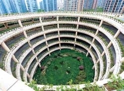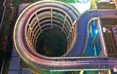 停车场建设完成于2009年,经过绿化改造后重新亮相,整体变得现代美观。通往停车场的坡道盘旋而上,被花花草草环绕,“都市丛林”感扑面而来。停车场内观酷似“鸟巢”,资源利用最大化的同时,既具设计感又有新意。