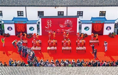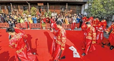 富义仓婚礼现场,浓郁的传统文化气息扑面而来,运河边嫁娶习俗再现。当天婚礼现场设计了诗礼传家文化四重门,由北往南分别是合卺门、情定三生门、却扇门、词赋满江门。十对新人跨火盆、走米袋、跨马鞍……在在座众多来宾的见证下,三拜天地,签下婚书,共饮合卺酒,从此携手度余生。