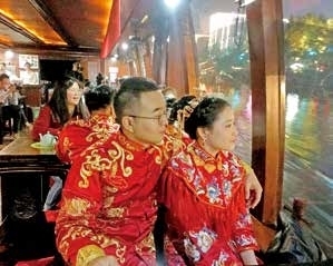 新人们前往香积码头,乘着漕舫游览运河。在古色古香的船舱内,在潺潺流动的运河之上,十对新人带上所有祝福,携手走入人生的另一阶段,开启他们的幸福余生。