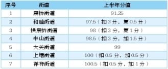 1.主要指标。半山街道、祥符街道、上塘街道等三个单位因MEI综合指数5月、6月得分前三位予以加分;拱宸桥街道、大关街道、和睦街道等3个单位因得分末三位被扣分。