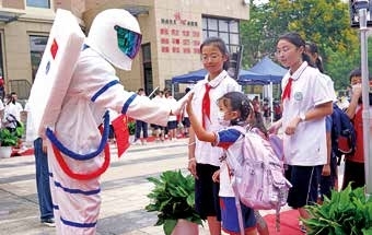 杭十四中附属学校,老师扮演成宇航员形象,欢迎新同学的到来