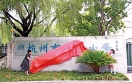 在“遇见长青,预见未来”开学典礼上,书写校名的孩子们和校长一同完成了长青新校名揭牌仪式