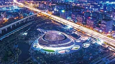 蜿蜒流水造型的运河大剧院,在夜幕下璀璨亮眼;外形酷似“星际战舰”的杭州亚运会电竞馆绚丽夺目;运河亚运公园映衬在蓝天白云下,金灿灿“玉琮”造型的国球中心、“杭州伞”造型的曲棍球馆,格外抢眼。