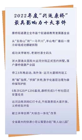 2022年,康桥街道立足大城北核心示范区功能定位,打造“兴运康桥”品牌,聚焦全面从严治党,厚植为民情怀,高品质建设大运河幸福家园,在奋力推进“两个先行”中争做头雁争当样板。一年来,街道产业更优化、环境更宜居、治理更智慧、生活更美好,经济社会各项事业再上新台阶。