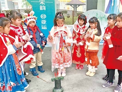 开学活动上,传统文化依然是魅力担当。和睦小学通过邀请小书法家题字为同学们送上新学期祝福,各班同学还卷起了袖子打年糕、做春卷,迎接新学期的到来;在春蕾中学门口,击鼓明志表决心、佳果送福有盼头、手系红绳抒梦想等为同学们拉开新学期的序幕。指间宋韵,@亚运。文澜实验学校同学们身着汉服,在机器人“小胖”的引领下,穿梭在宋韵长廊,沉浸式体验了投壶、剪纸、篆刻、书法、木版水印等活动。