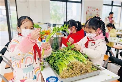 “种子该怎么养?”“真的能种出菜来吗?”在拱宸中学校园里,开学首日即传来阵阵惊叹声。原来学校为他们精心准备了一道“种子大餐”,老师们为每位同学派发了“成长种子”,勉励孩子们新学期里争做一只“勤劳兔”,祝愿孩子们勤劳奋进出成果。开学这天,新华实验小学的同学们也忙着在食堂摘芹菜叶剥毛豆,体验劳动的价值。