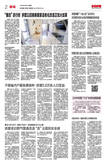 本报讯(记者 杨凌紫 通讯员 韩蕾 毕宏雪 程嘉敬)近期,拱墅区积极响应号召,大力推进以旧换新居家适老化改造,围绕“如厕洗澡安全、室内行走便利、居家环境改善、智能监测跟进、辅助器具适配”五大方面,为更多老年人打造更加便捷、舒适的生活环境。