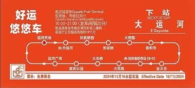 “好运悠悠专线”始发站为运河天地站,途径大运河站、拱宸桥西站、长征桥站、大兜路站、香积寺站、富义仓站、地铁香积寺路站、大关桥站、紫荆公园站、运河广场站,再返回运河天地站,共设11个站点,环线全长约13公里,坐一整圈用时约50分钟。