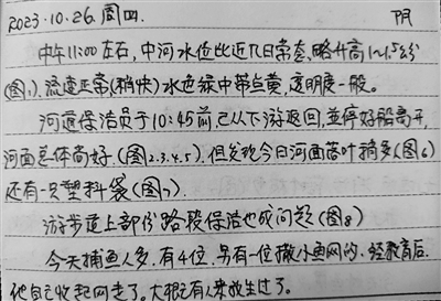 时间、水位、水质、流速,水里有没有污染物、沿河的雨水管道污水排放情况、河边路面的保洁情况——这是吴老巡河日记中常常出现的关键词。十年来,不管寒冬酷暑还是刮风下雨,年过古稀的吴老坚持定期对河道进行巡查、对河道水质状况进行实地监督。
