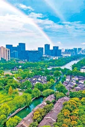 从文晖大桥北望,清澈运河与林立楼宇相映,作为杭城东大门的文晖街道,如今已是城市核心区。运河、上塘河、备塘河水清岸绿,东新河、长浜河、南应加河风光旖旎,这里水系环绕、景致宜人,杭氧老厂房蝶变为武林之星博览中心,成为年轻人追捧的潮流地标。