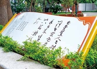 既然文化根脉在这里,就该趁机让它“活”回来。街道和黄德华先生一拍即合,决定将黄庭坚元素植入了此次改造中:小区门口增设黄庭坚祠历史介绍牌,清晰梳理祠堂沿革与黄庭坚生平;中心花园里,一座实卷轴景观小品静静矗立,复刻着黄庭坚《花气熏人帖》的苍劲笔意;社区外墙等处展示他的文章、诗句、生平经历。沉睡千年的文人风骨,就这样悄悄融入了老小区的日常。